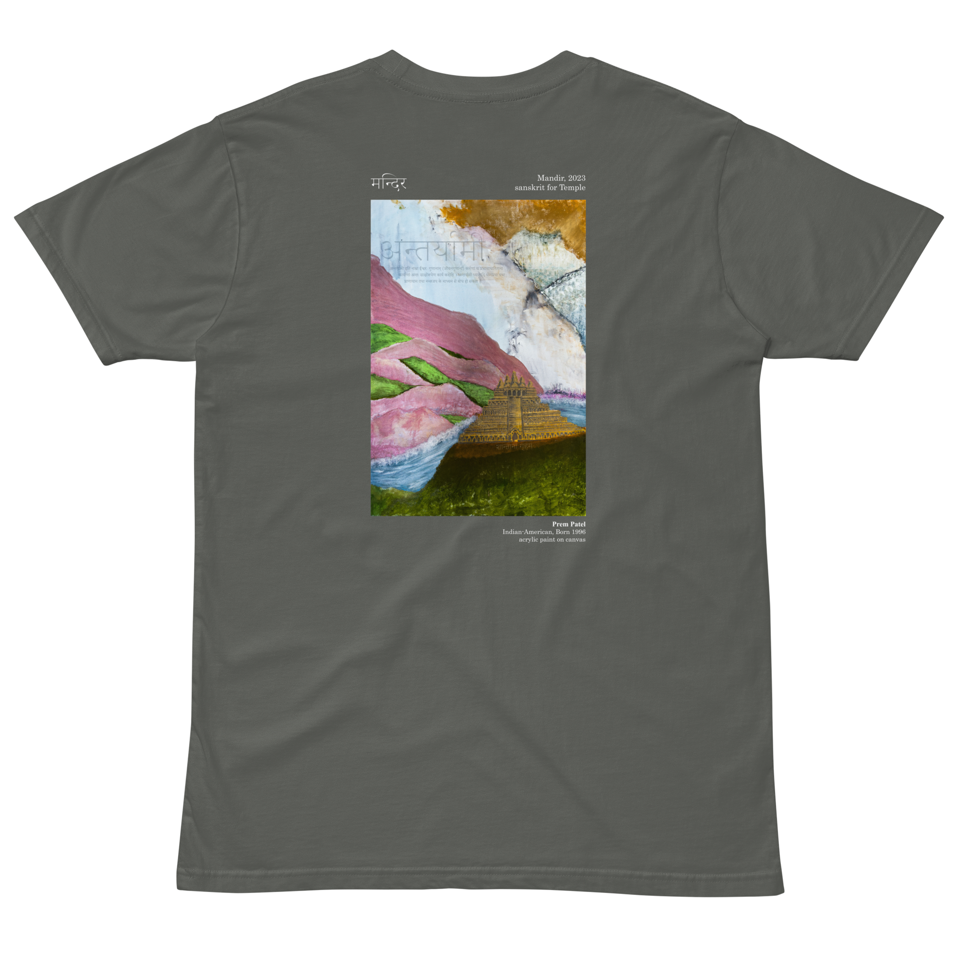 Discover the elegance of the Mandir Tee, designed by the artist SHAANT. This tee showcases the exquisite "Mandir" painting, which translates to "temple," beautifully displayed on the front. The artwork captures the serenity and grandeur of a temple, bringing a sense of peace and spirituality to this simple and classic tee. Perfect for any occasion, the Mandir Tee combines comfort with a touch of artistic sophistication, making it a versatile and meaningful addition to your wardrobe.